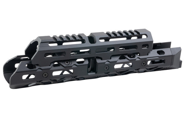 The 1U020B handguard is an modernisation upgrade for CYMA AKM, 74S and 105 AEG rifle series, providing owners with the option of adding personal effect onto the handguard, namely peripheral accessories. Precision machined with aluminium, the handguard features an aggressive structural profile, with weight saving angular cut outs to reduce the overall weight of the rifles when adding this modular upgrade. The handguard features Picatinny and M-LOK rail interface, providing modular accessory options for the shooter to add on and personalise their AK, with a unique twist of dual layer M-LOK available on the sides of the handguard. The handguard has a simple installation process, able to retain the original cleaning rod stowage point for the AKM platform.