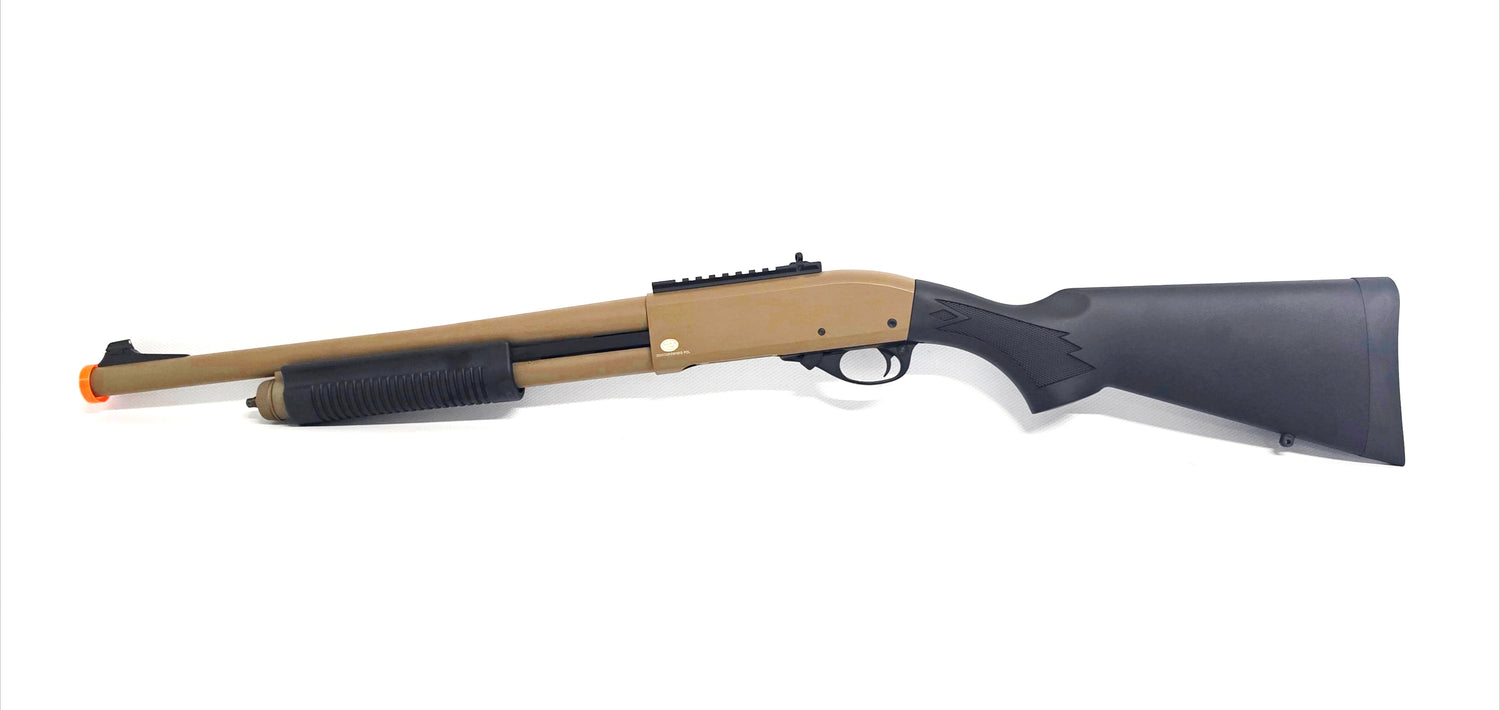 This shotgun replica is powered by Green Gas and made almost entirely of metal. Metal parts include: the barrel, the receiver or RIS rail located on top. Polymer parts include also the handguard, stock and other, miscellaneous elements.