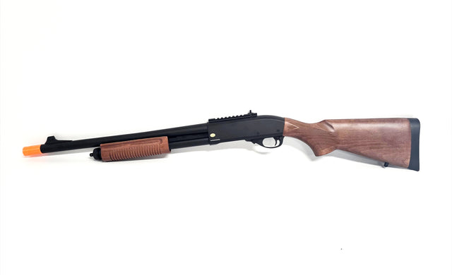 This shotgun replica is powered by Green Gas and made almost entirely of metal. Metal parts include: the barrel, the receiver or RIS rail located on top. Polymer parts include also the handguard, stock and other, miscellaneous elements.