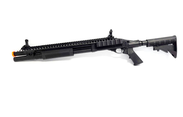 This shotgun replica is powered by Green Gas and made almost entirely of metal. Metal parts include: the barrel, the receiver, the buffer tube or the top RIS rail. Polymer parts include the pistol grip, the stock, the forend, flip-up iron sights and other, small elements.