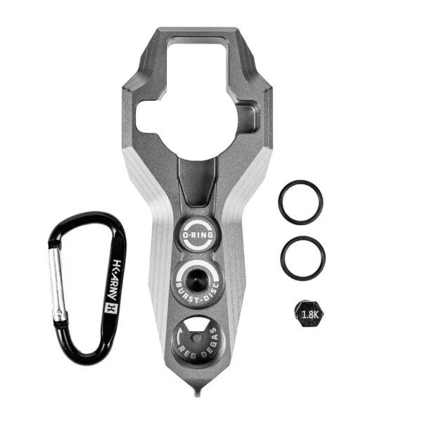 HK Army Reg Multi-Tool – the ultimate tool for keeping your tank setup dialled in and ready to roll. This tool lets you safely degas, remove, and fine-tune your regulator with ease. Its durable aluminium build, laser detailing, and smart, field-ready design mean it’s tough enough to take on any challenge – and compact enough to stay by your side with the included carabiner clip.