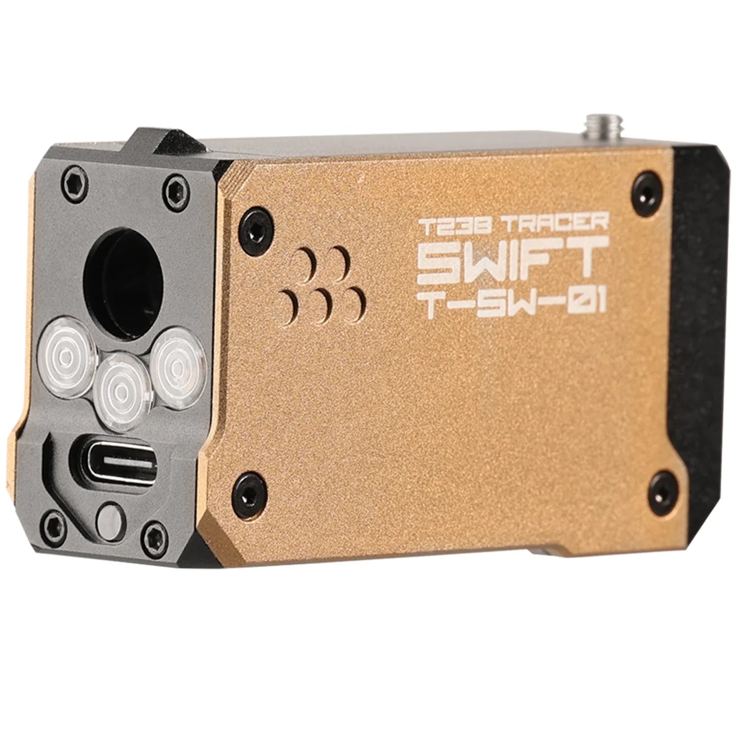 The T238 SWIFT is a lighting device compatible with both 14mm CCW and 11mm CW interfaces. This device integrates tracer BB charging functionality and muzzle flash simulation. When triggered, the system illuminates luminescent projectiles, enabling them to maintain visibility during flight, while simultaneously activating LED modules to simulate muzzle flash effect.