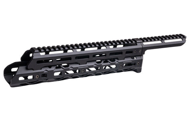 The 5KU Long Handguard with Optics Mount is a modernisation enhancement designed for the Tokyo Marui Saiga-12K GBB Shotgun. Drawing inspiration from the KPYK aesthetic, this handguard features angular cutouts that reduce weight, mirroring the KPYK style. It boasts an extended Picatinny top rail for mounting optics and additional devices, complemented by an M-LOK rail interface for versatile accessory attachment. Crafted from precision-milled aluminium, this handguard offers a robust yet lightweight solution, making it an excellent choice for enthusiasts of the KPYK design.